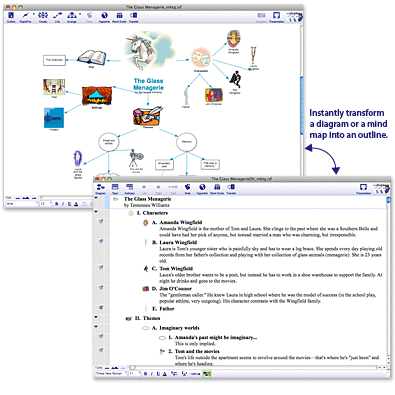 For visual mapping, outlining, writing and making presentations, use Inspiration® 9, the ultimate thinking and learning tool. Brainstorm ideas, structure your thoughts and visually communicate concepts to strengthen understanding with the Diagram and Map Views. To take notes, organize information, and structure writing for plans, papers and reports, use the integrated Outline View to focus on main and supporting ideas and to clarify thinking in written form. With Inspiration's Presentation Manager, transform your diagrams, mind maps and outlines into polished presentations that communicate ideas clearly and demonstrate understanding and knowledge